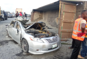 A tragic road accident in Lagos claimed the life of a male motorist on Thursday morning, while his wife sustained critical injuries after a granite-laden truck toppled onto their Toyota saloon car. The incident occurred at Eleko Junction along the Lekki–Ajah Expressway, a busy route in the state.According to officials from the Lagos State Traffic […]