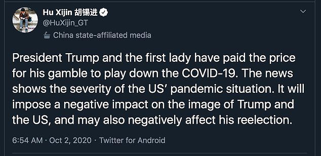 Hu Xijin, the editor-in-chief of the Global Times, a major Chinese tabloid and mouthpiece of the Communist Party, said that President Trump and his wife ‘have paid the price for his gamble to play down the COVID-19