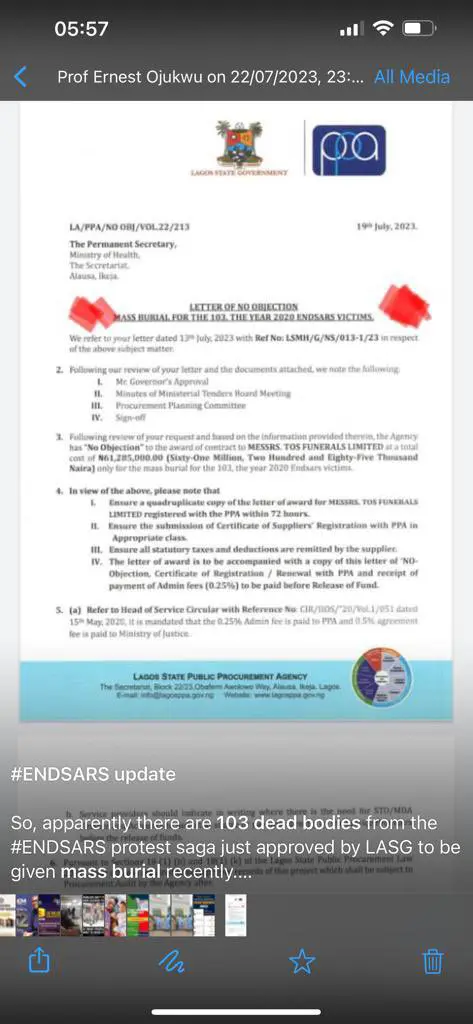 A leaked memo addressed to the Lagos State Ministry of Health indicating that the State Government approved N61,285,000 for the mass burial of 103 people identified as 2020 EndSARS victims has gone viral on social media, sparking outrage.