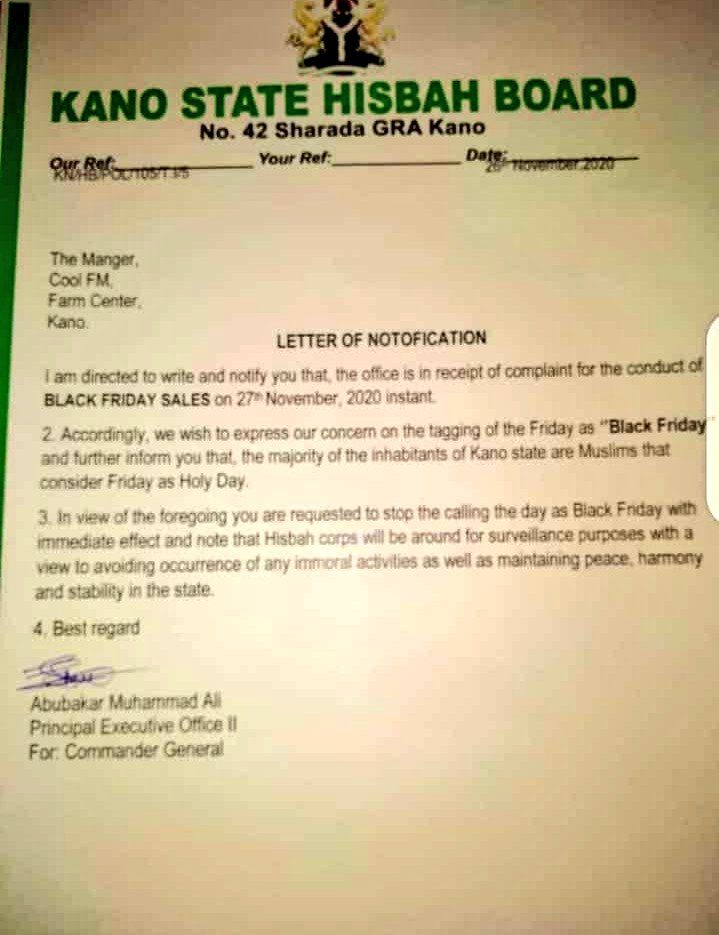 “In view of the foregoing, you are requested to stop calling the day ‘Black Friday’ with immediate effect and note that the Hisbah Corps will be around for surveillance purposes with a view to avoiding occurrence of any immoral activities as well as maintaining peace, harmony and stability in the state.”