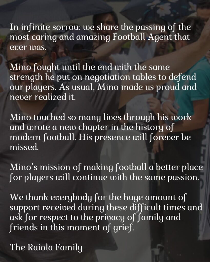 “They added “Mino fought until the end with the same strength he put on negotiation tables to defend our players.”Mino’s mission of making football a better place for players will continue with the same passion,” the family added.