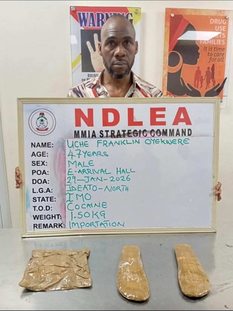 A Nigeria businessman residing in Brazil, Uche Franklin Onyekwere, was arrested by operatives of the National Drug Law Enforcement Agency (NDLEA) at the Murtala Muhammed International Airport (MMIA) in Ikeja, Lagos for concealing cocaine in his private parts (genitals) and the soles of his shoes.