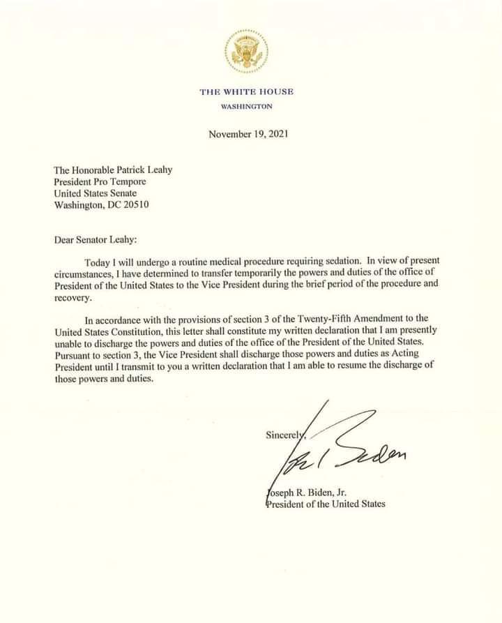 In accordance with the provisions of section 3 of the Twenty-Fifth Amendment to the United States Constitution, this letter shall constitute my written declaration that I am presently unable to discharge the powers and duties of the office of the President of the United States.