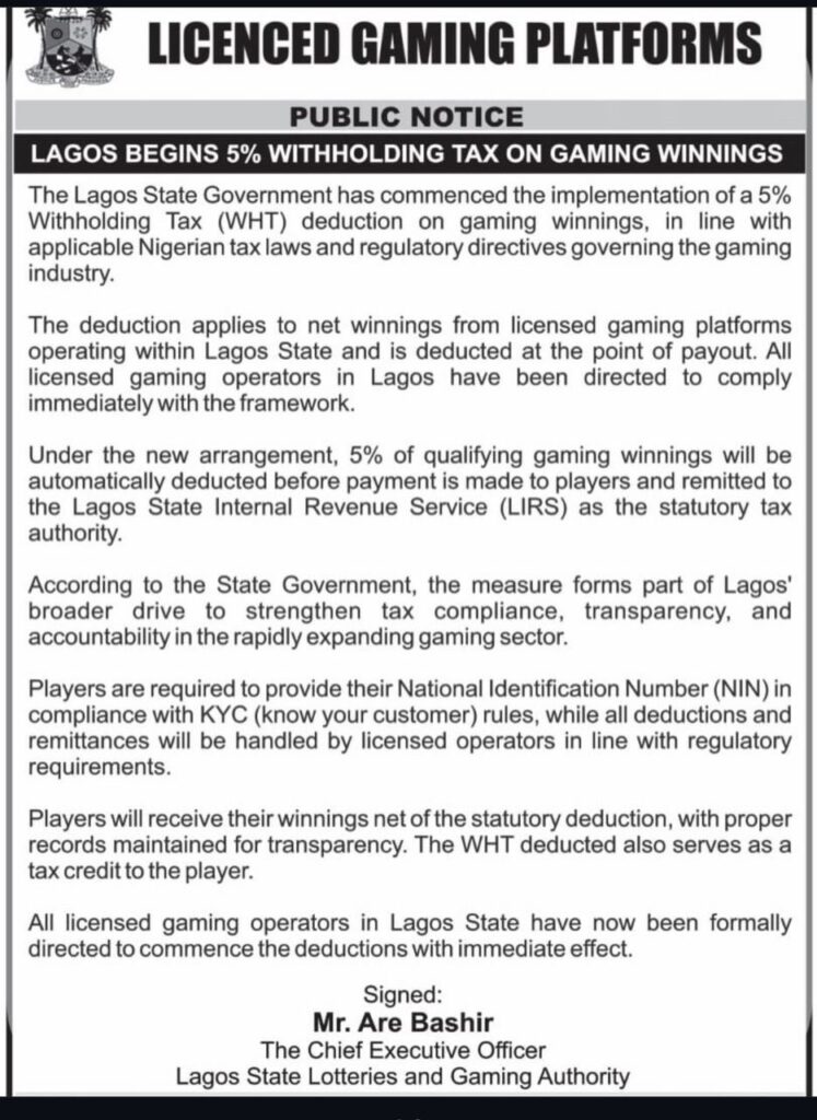 This move, announced by the Lagos State Lotteries and Gaming Authority (LSLGA), aligns with existing Nigerian tax laws and aims to enhance revenue collection, transparency, and compliance in the rapidly growing gaming sector.Under the new directive, issued by LSLGA CEO Bashir Are, licensed operators—both online and land-based—are required to automatically deduct 5% from players’ qualifying net winnings at the point of payout.