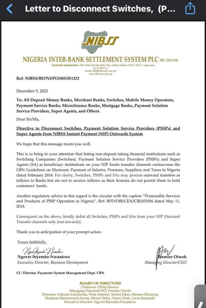 It said, “This is to bring to your attention that listing non-deposit-taking financial institutions such as Switching Companies, Payment Solution Service Providers, and Super Agents as beneficiary institutions on your NIP funds transfer channels contravenes the CBN Guidelines on Electronic Payment of Salaries, Pensions, Suppliers, and Taxes in Nigeria dated February 2014.”