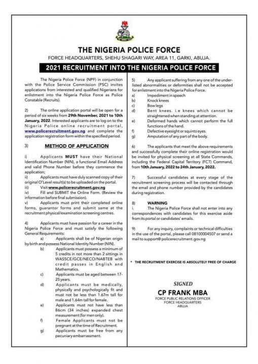 In the statement titled, ‘2021 recruitment into the Nigeria Police Force’, the force announced that successful applicants would be enlisted as Police Constables (recruits).